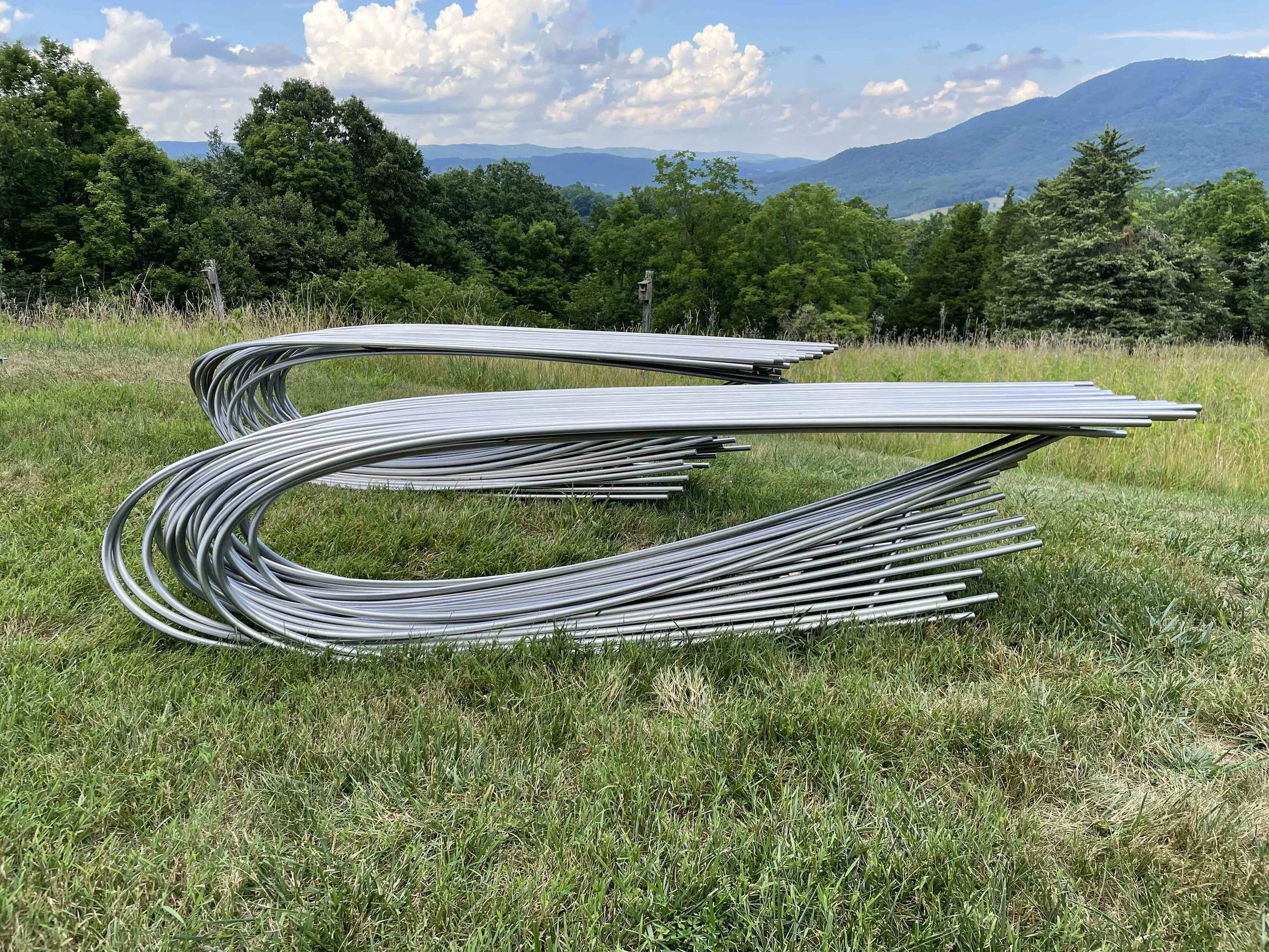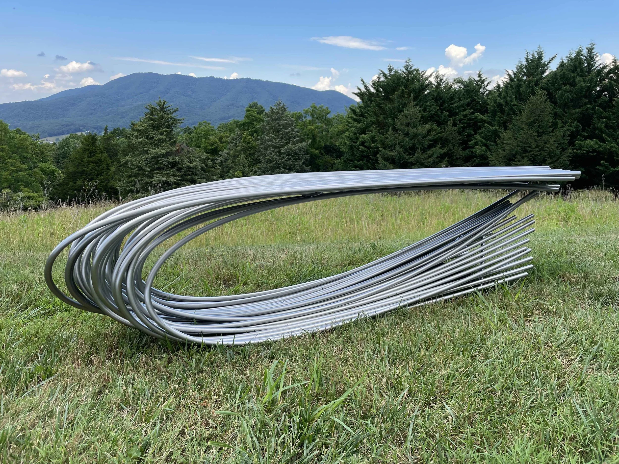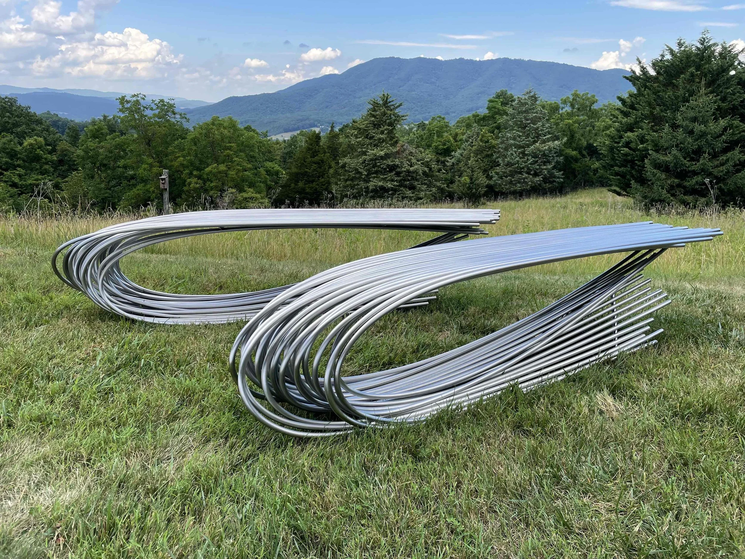An idea ten years in the making found a home in Montana. Drenched hayfields and their yielding forms became a catalyst for a pair of stainless steel benches for a private residence in Bozeman with pastoral views.